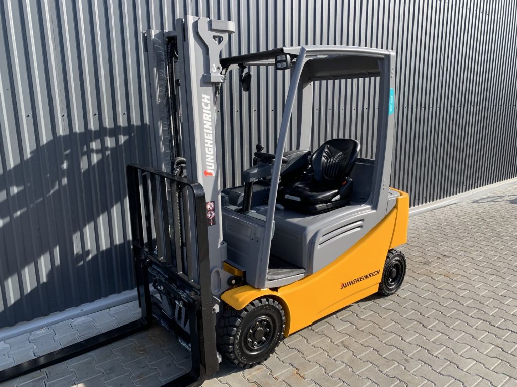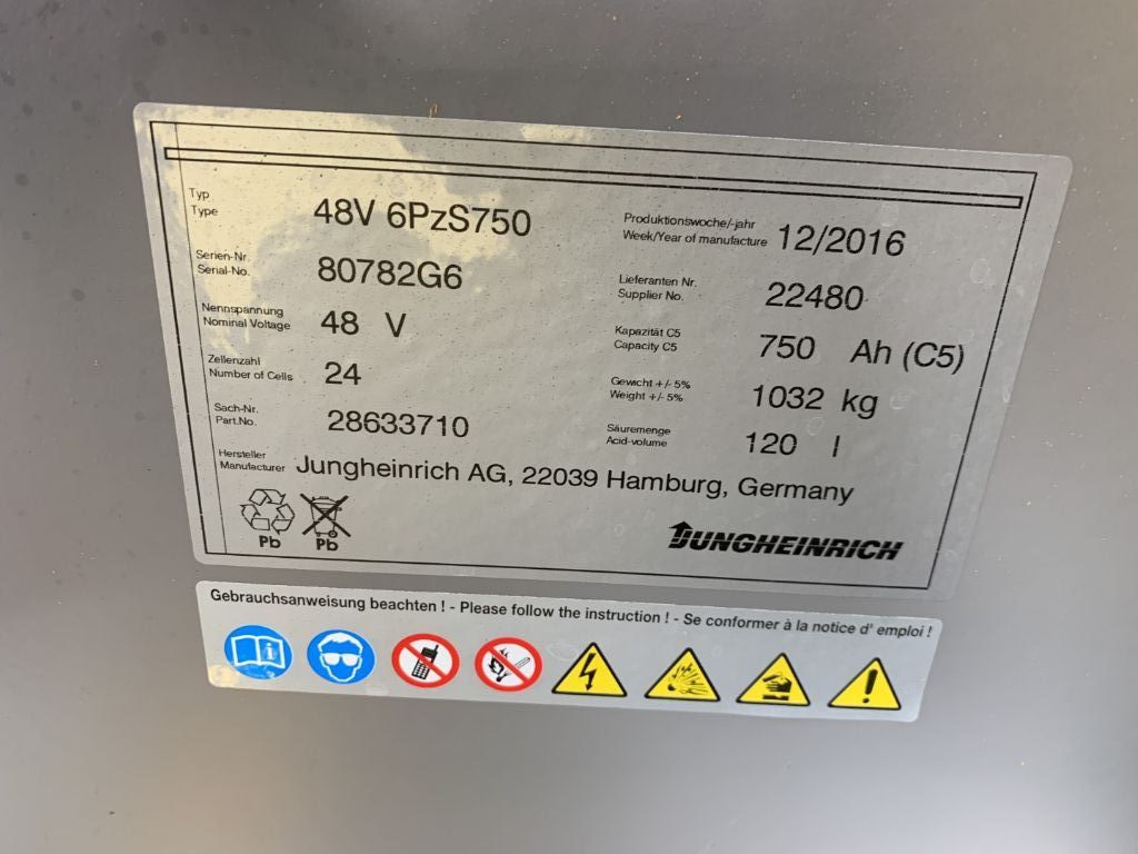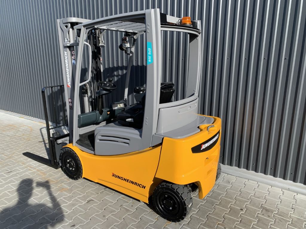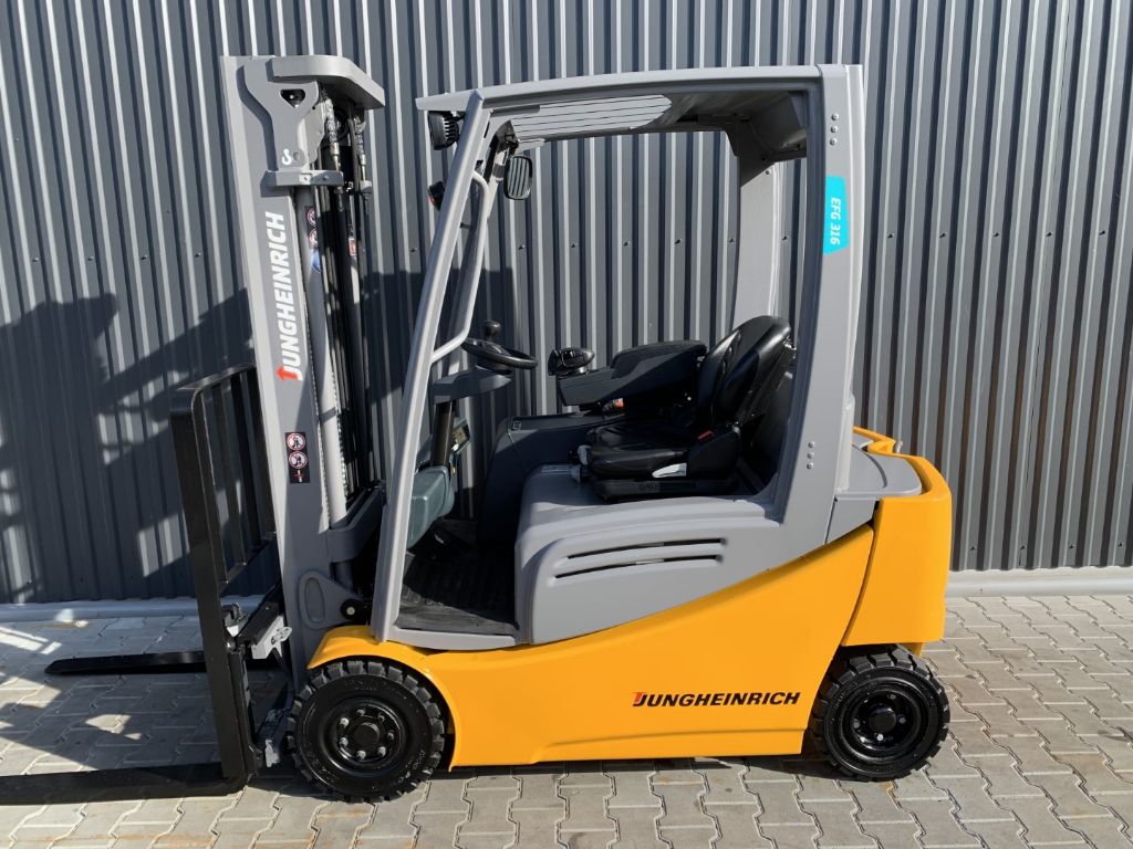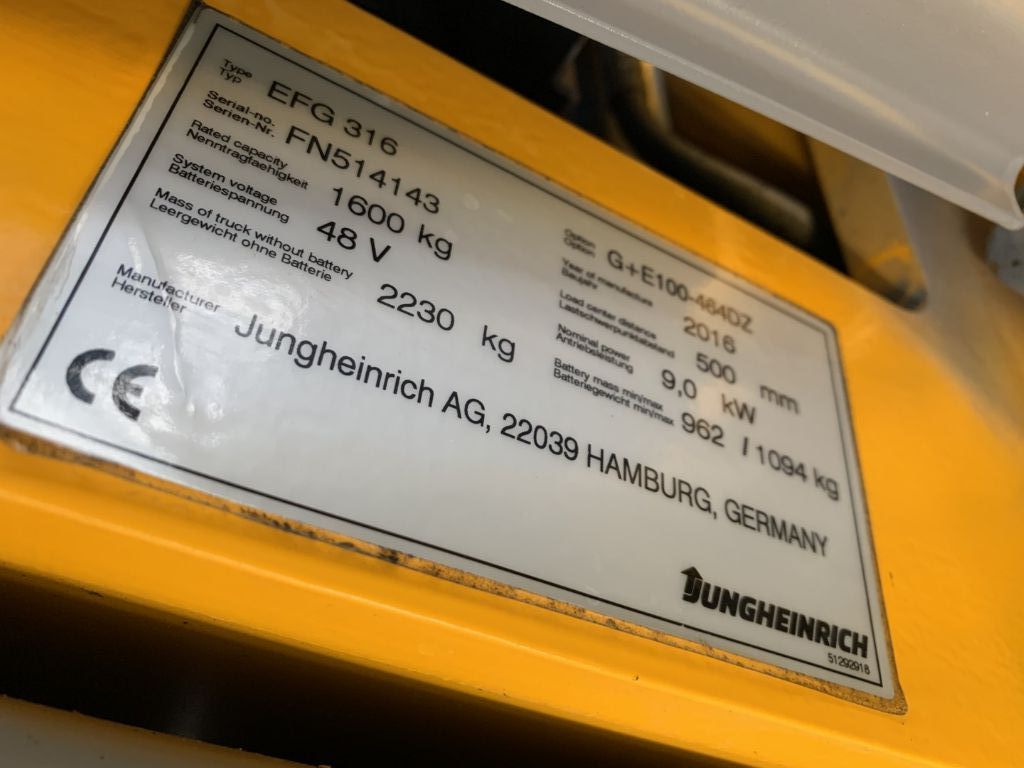 View datasheet Mast data & Tyres Brands: Jungheinrich Model: EFG316 Type: Electric 4-wheel forklift Engine type: Electric Capacity: 1600 kg Year: 2016 Hours: 3542 Mast: Triplex Lift height: 4640 mm Free lift: 1515 mm Dimensions Motor, battery and charger Closed height: 2105 mm Battery: 48V, Description & Add. equipment Attachments: Side Shift