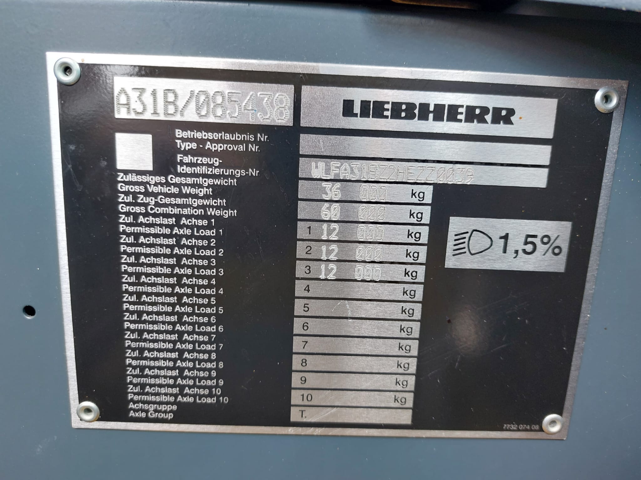 Specifications Capacity 55 ton Year 2017 Serial number 085438 Data truck chassis Chassis number WLFA31BZ2HEZZ0039 Tires size 385/95R25 Chasis drive 6x6x6 Mileage 100075km Operating hours 2992h Engine Liebherr D936L A6 Gear box ZF-AS-TRONIC Data superstructure Main boom 40mtr Counterweight 7t Jib 16 mtr Hookblocks 3 sheave 30,2t Winches 1 Safety Liccon 75% Operating hours 6552h